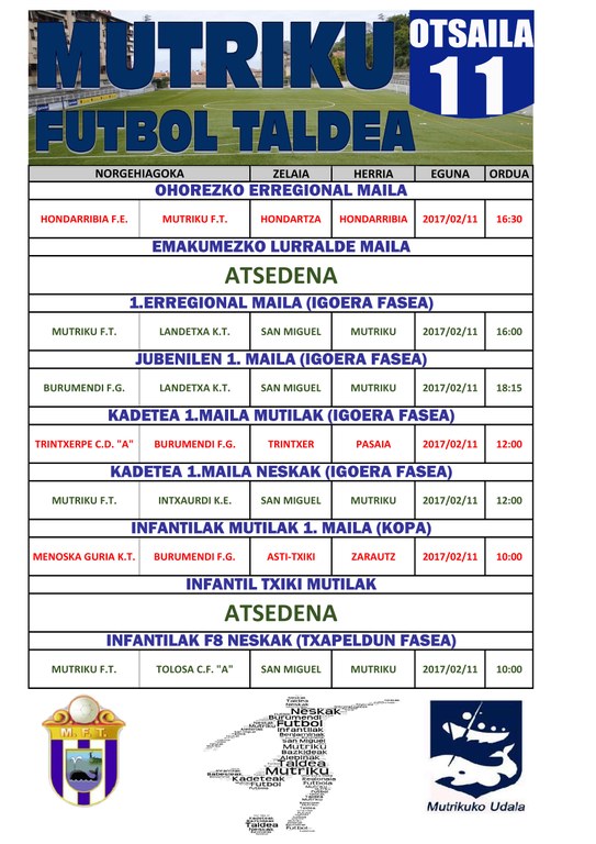 Cartelera del fin de semana de Mutriku Futbol Taldea.