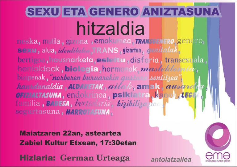 Organizado por EMA, el próximo 22 de mayo se celebrará en la Casa de Cultura Zabiel una charla sobre la Diversidad de Sexo y Género a partir de las 17.30. El joven beasaindarra German Urteaga será quien se encargue de dar la citada charla.
