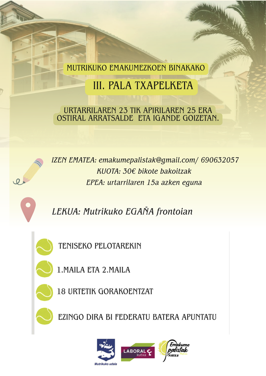En el Campeonato de mujeres palistas de 1ª y 2ª división que organiza Naixa Emakume Palistak y patrocina el Ayuntamiento, se jugarán de manera excepcional los siguientes días y horarios, del 23 de enero al 25 de abril de 2026: