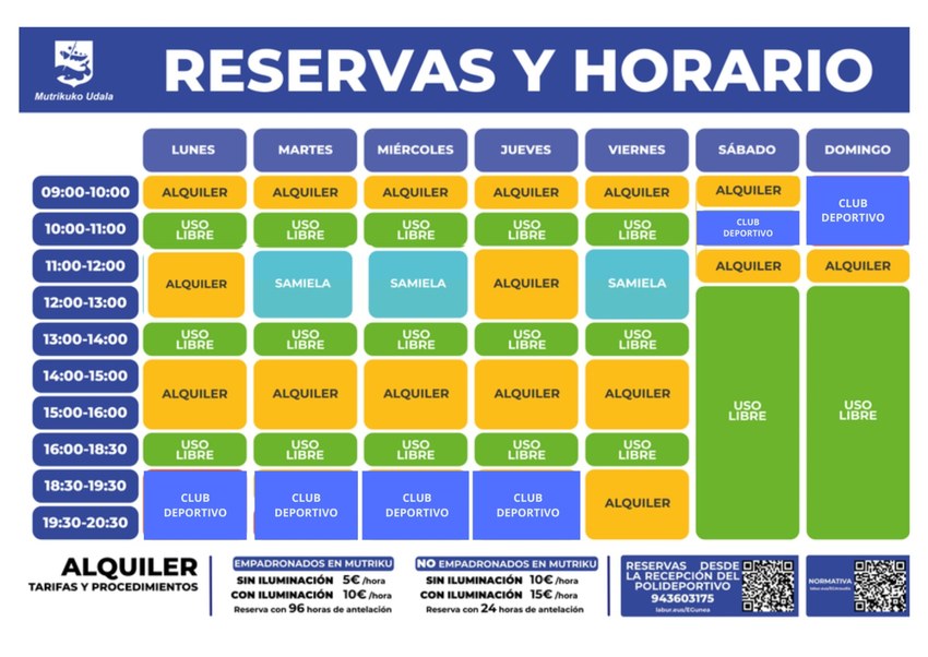 Previa llamada al Polideportivo, se deberá facilitar una dirección de correo electrónico para compartir Google Calendar e inspeccionar las horas de alquiler.