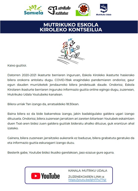 - Mutrikuko Eskola Kiroleko 2020-2021 ikasturteko aurkezpen bilera