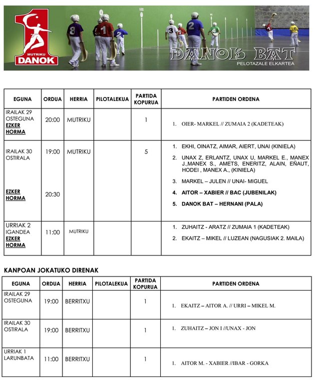Danok Bateko asteburuko karteldegia.Irudian asteburuan Danok Bateko pilotariek jokatuko dituzten partida guztien ordutegiak.https://www.mutriku.eus/eu/albisteak/danok-bateko-asteburuko-karteldegia-1https://www.mutriku.eus/eu/albisteak/danok-bateko-asteburuko-karteldegia-1/@@download/image/danok bat.jpg