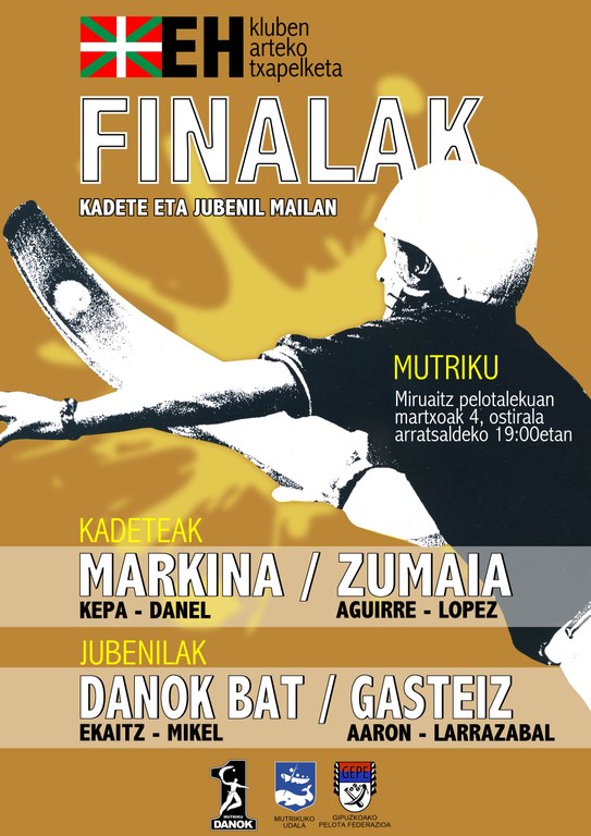 Kadete eta gazte mailako finalak Miruaitzen ospatuko dira ostiral honetan, 19.00etatik aurrera. Kadete mailan Markina (Kepa-Danel) eta Zumaia (Agirre-Lopez) arituko dira nor baino nor, eta gazte mailan berriz, Danok Bat (Ekaitz-Mikel) eta Gasteiz (Aaron-Larrazabal).