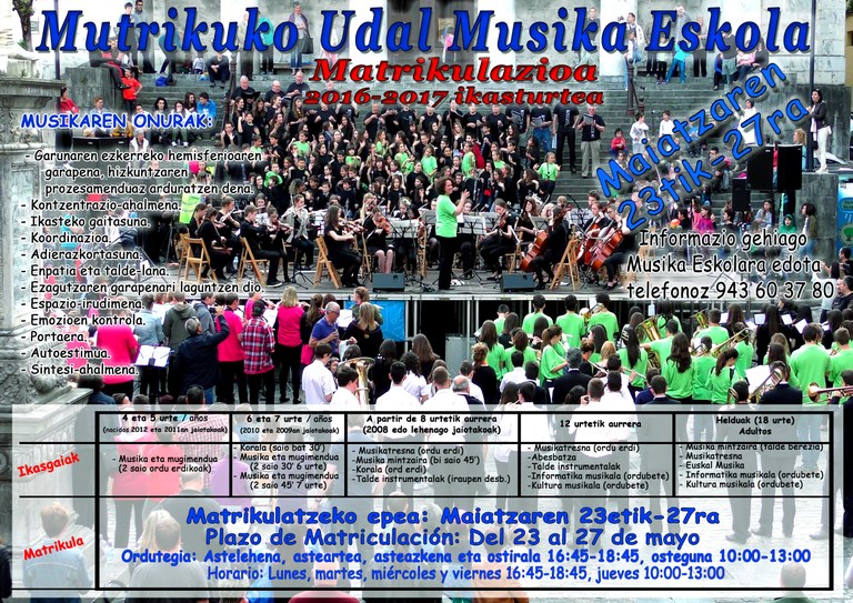 Matrikulazioa Musika Eskolan2016 - 2017 ikasturtean Musika Eskolan izena emateko epea maiatzaren 23tik 27ra izango da.https://www.mutriku.eus/eu/albisteak/matrikulazioa-musika-eskolanhttps://www.mutriku.eus/eu/albisteak/matrikulazioa-musika-eskolan/@@download/image/Matrikulazioa 2016 kartela.jpg