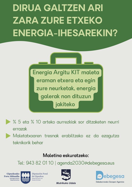 Gipuzkoako Foru Aldundiak, “Energia Argituz” kanpainaren bidez, etxebizitzetan energia eraginkortasunarekin lotutako neurketa sinpleak egiteko maletatxoak eskaintzen ditu. Ekimen hori oinarri hartuta, Udalak eta Debegesak, Debabarreneko Garapen Agentziak, zerbitzu berri bat jarri du herritarren eskura: norberaren etxebizitzako energia diagnostiko sinplifikatuak egiteko maletatxoak.
