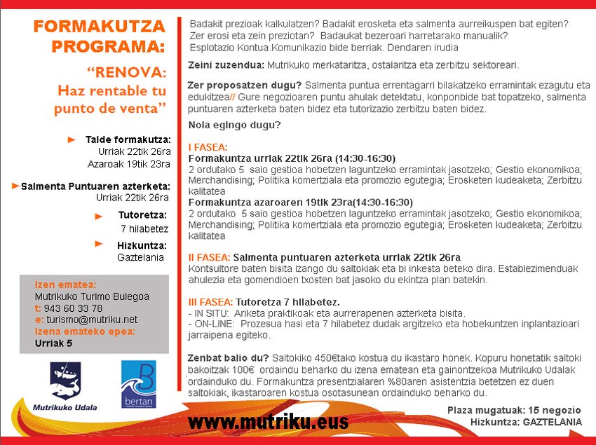 Formakuntza honen helburua Mutrikuko saltokiek bere profesionalizazio maila handiagotzearena da, saltokiak konpetitiboagoak izan daitezen. Horretarako formakuntza espezifikoa jasoko dute, hainbat alorretan, hala nola, gestio ekonomikoa, politika komertziala, promozio egutegia, erosketa kudeaketa, zerbitzuaren kalitatea… eta beste hainbat gai landuko dira. Horrez gain, ikastaroan parte hartzen duten negozioei, azterketa bat egingo zaie, bere egoera ikusi eta hobetze aldera ekintza plan bat garatzeko. Ekintzak inplantatzen joateko on-line tutoretza zerbitzu bat izango dute prozesu guztiaren jarraipena izango dutelarik.